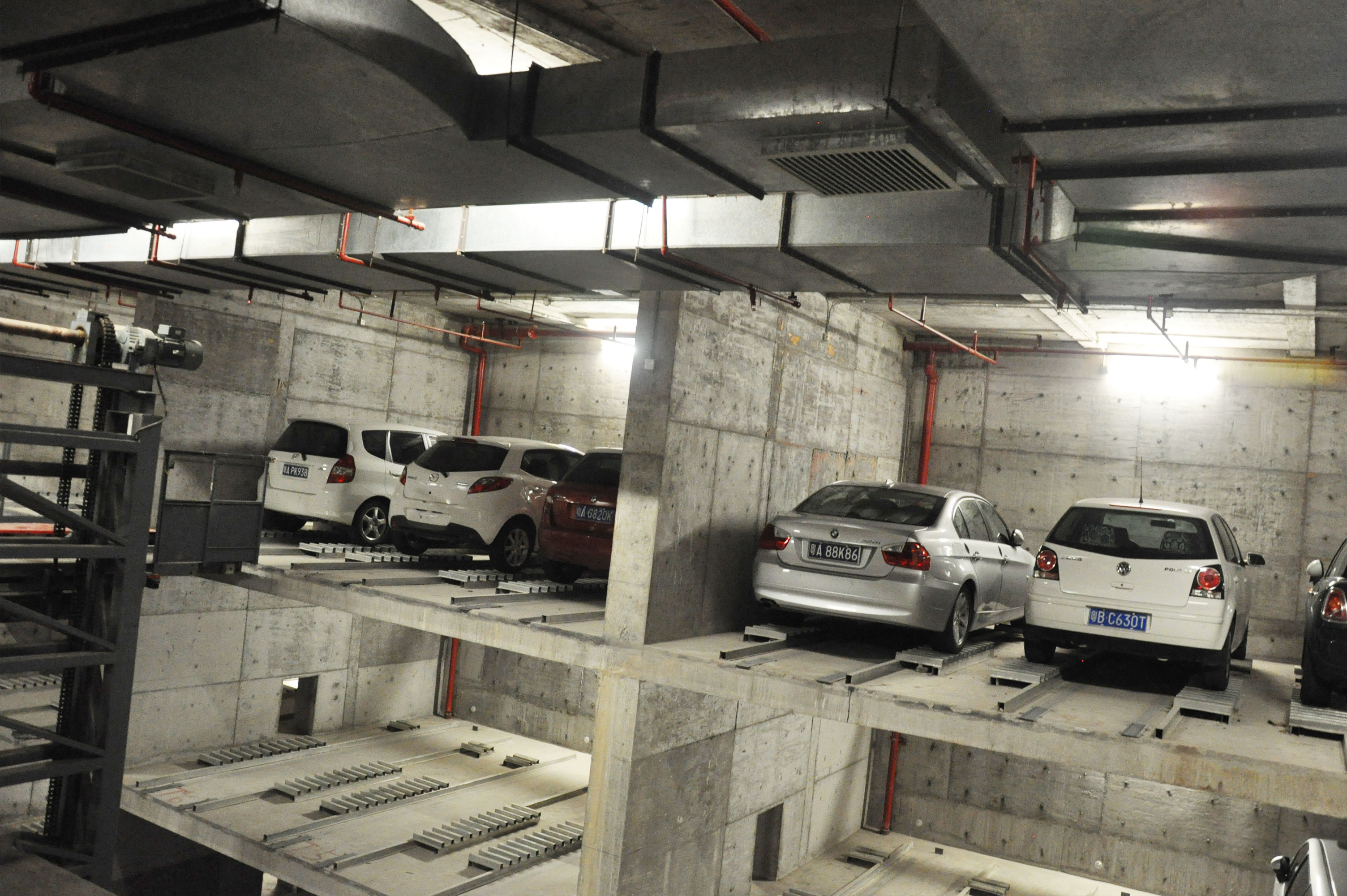 在兩側(cè)泊位的中間設(shè)有巷道堆垛機,整個車庫的運行均由堆垛機和搬運器來完成。汽車入庫時,汽車停在出入庫臺上,堆垛機從出入庫臺上取走汽車后在巷道內(nèi)行走并提升,將汽車運送到指定層的泊位旁,堆垛上的搬運器將汽車從堆垛機送入泊位堆垛機利用先進技術(shù)無縫整合了升降和行走兩套系統(tǒng),并配備變頻控制系統(tǒng),采用激光測距來行走定位,采用光通訊無線信號傳送,實現(xiàn)邊行走邊升降的功能以達到節(jié)約時間、降低能耗和空間利用的目的。