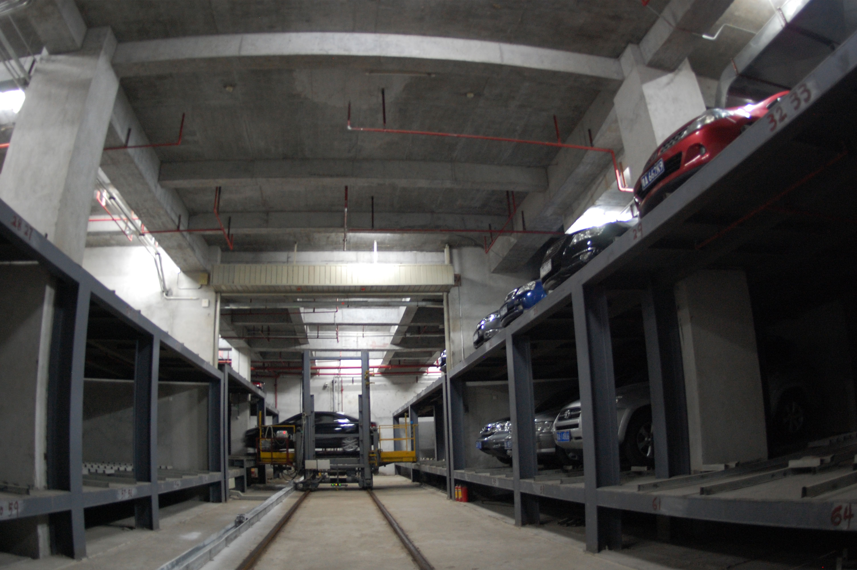 在兩側(cè)泊位的中間設(shè)有巷道堆垛機(jī),整個(gè)車(chē)庫(kù)的運(yùn)行均由堆垛機(jī)和搬運(yùn)器來(lái)完成。汽車(chē)入庫(kù)時(shí),汽車(chē)停在出入庫(kù)臺(tái)上,堆垛機(jī)從出入庫(kù)臺(tái)上取走汽車(chē)后在巷道內(nèi)行走并提升,將汽車(chē)運(yùn)送到指定層的泊位旁,堆垛上的搬運(yùn)器將汽車(chē)從堆垛機(jī)送入泊位堆垛機(jī)利用先進(jìn)技術(shù)無(wú)縫整合了升降和行走兩套系統(tǒng),并配備變頻控制系統(tǒng),采用激光測(cè)距來(lái)行走定位,采用光通訊無(wú)線信號(hào)傳送,實(shí)現(xiàn)邊行走邊升降的功能以達(dá)到節(jié)約時(shí)間、降低能耗和空間利用的目的。